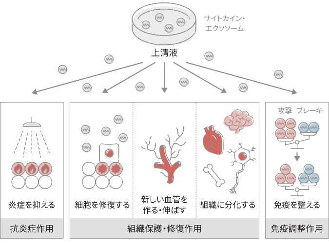 細胞そのものを移植するのではなく、幹細胞が分泌する有用成分(パラクライン因子)を活用できる点が特徴で、再生医療や美容医療の分野で広く応用が進められています。