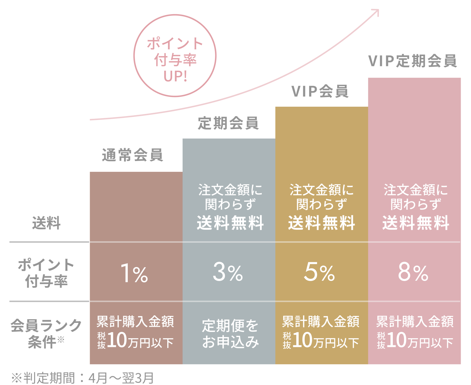 会員ランクごとに特別な特典をご用意しております。ご購入金額の合計(税抜)に応じてランクアップ!
